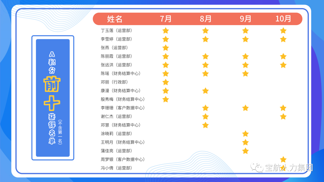 趁此機會,表彰7-10月份A積分排名前十的優(yōu)秀員工,以此鼓勵更多伙伴向他們學習。